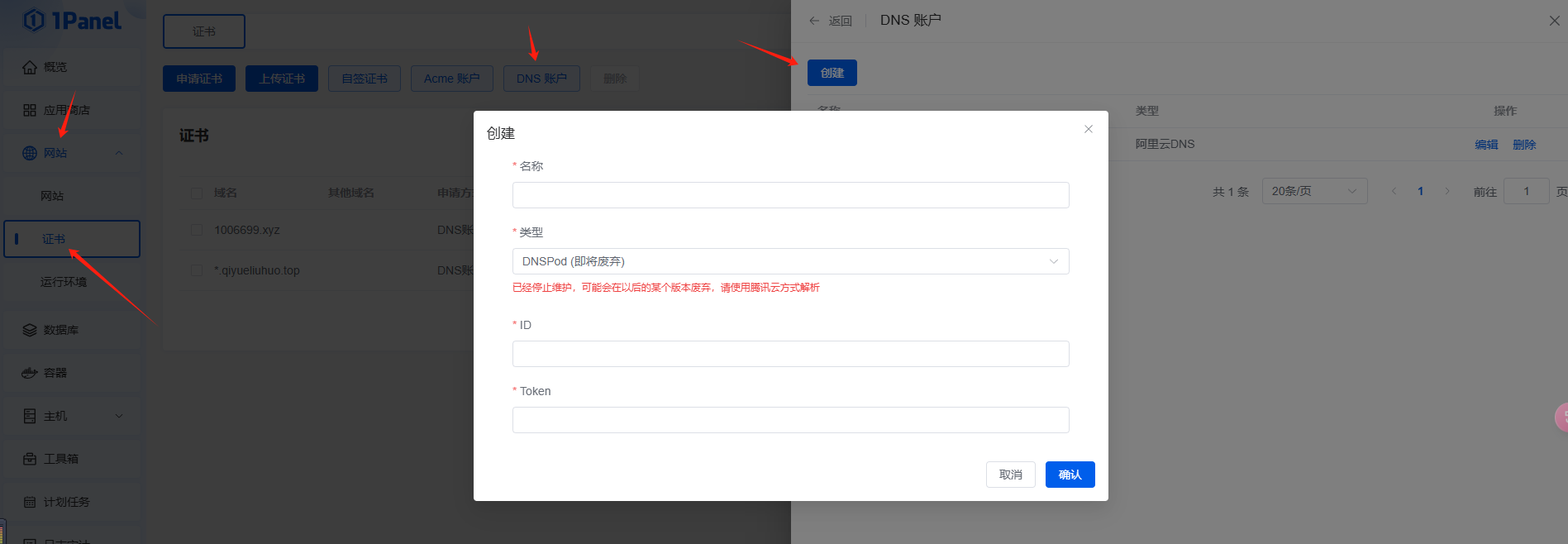 2.需要申请相关域名并在域名服务商处获取相关账号的登录秘钥在1pannel中维护