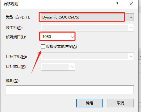 2.选择Dynamic(SOCKS4/5),默认会监听1080端口,建议勾选仅接受本地连接